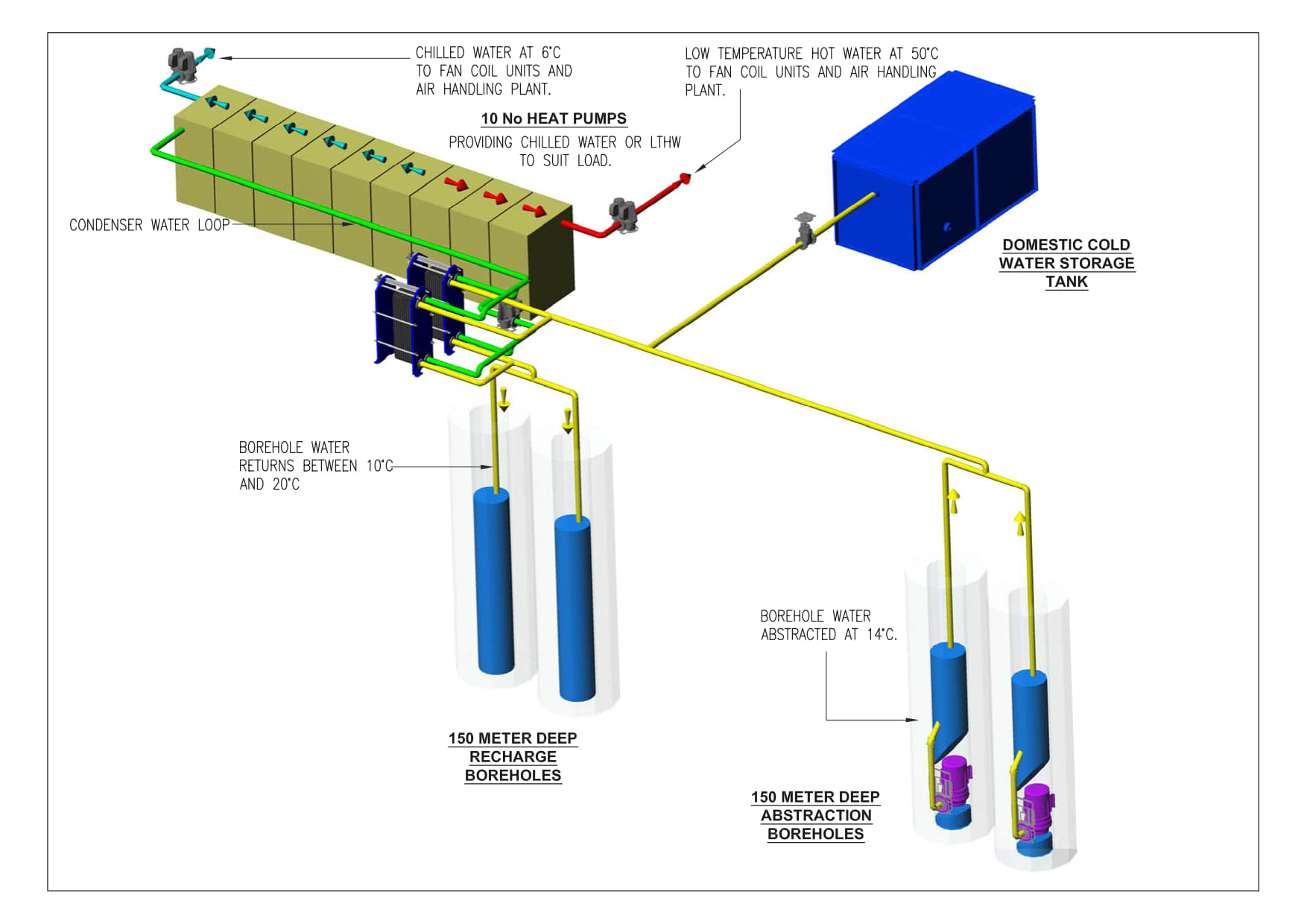 Project Details & Design WinsFour 150m boreholes were installed in the rear car park, enabling groundwater abstraction and reinjection. The system uses plate heat exchangers and reversible heat pumps to deliver simultaneous heating and cooling with COPs up to 6.0—achieving ~40% energy savings compared to conventional systems.