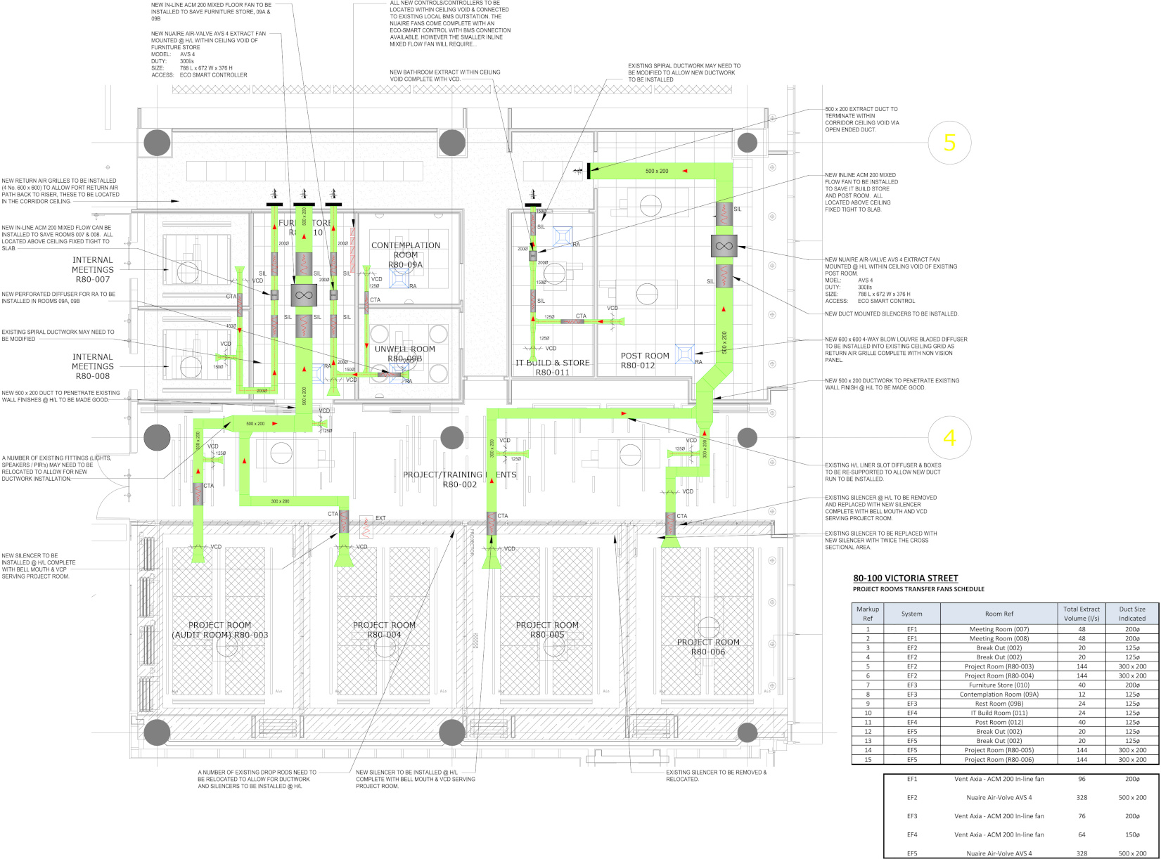 Delivery of bespoke extract systems for meeting rooms, juice bar, multi-faith and IT spaces. Included acoustic treatments and bellmouth modifications for optimal airflow and performance.