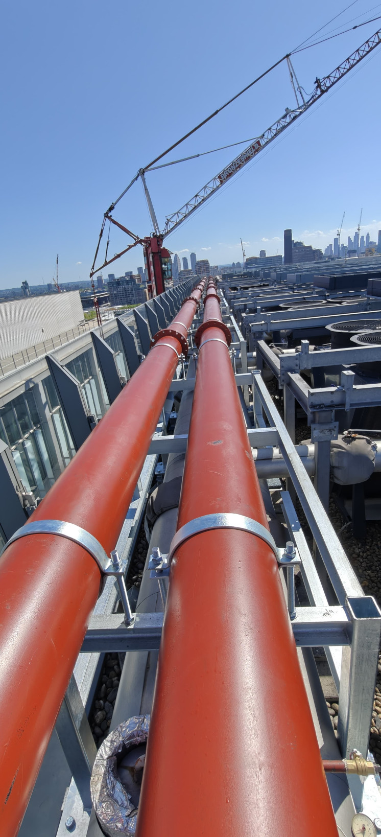 New low temperature hot water pipework has been installed to connect the newly introduced ASHPs, which now provide both heating and cooling. Previously, the rooftop chillers only served chilled water circuits. The new LTHW pipework spans the roof, descends via a dedicated riser, and links into the existing system headers within the boiler plant room, enabling full integration with the building’s heating infrastructure.