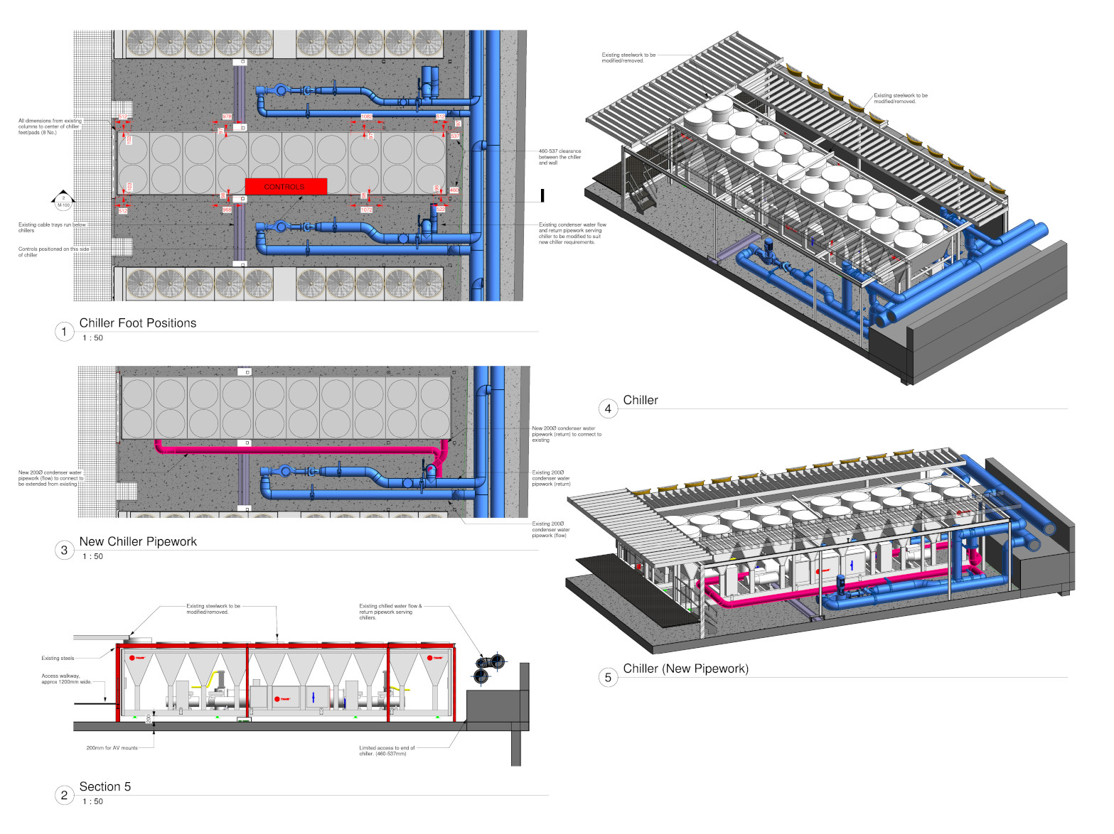 The new cooling system featured eight Carrier dry coolers and a high efficiency Trane chiller, interfaced with the existing Trane sequencer and electrical supplies for seamless integration and optimized performance.