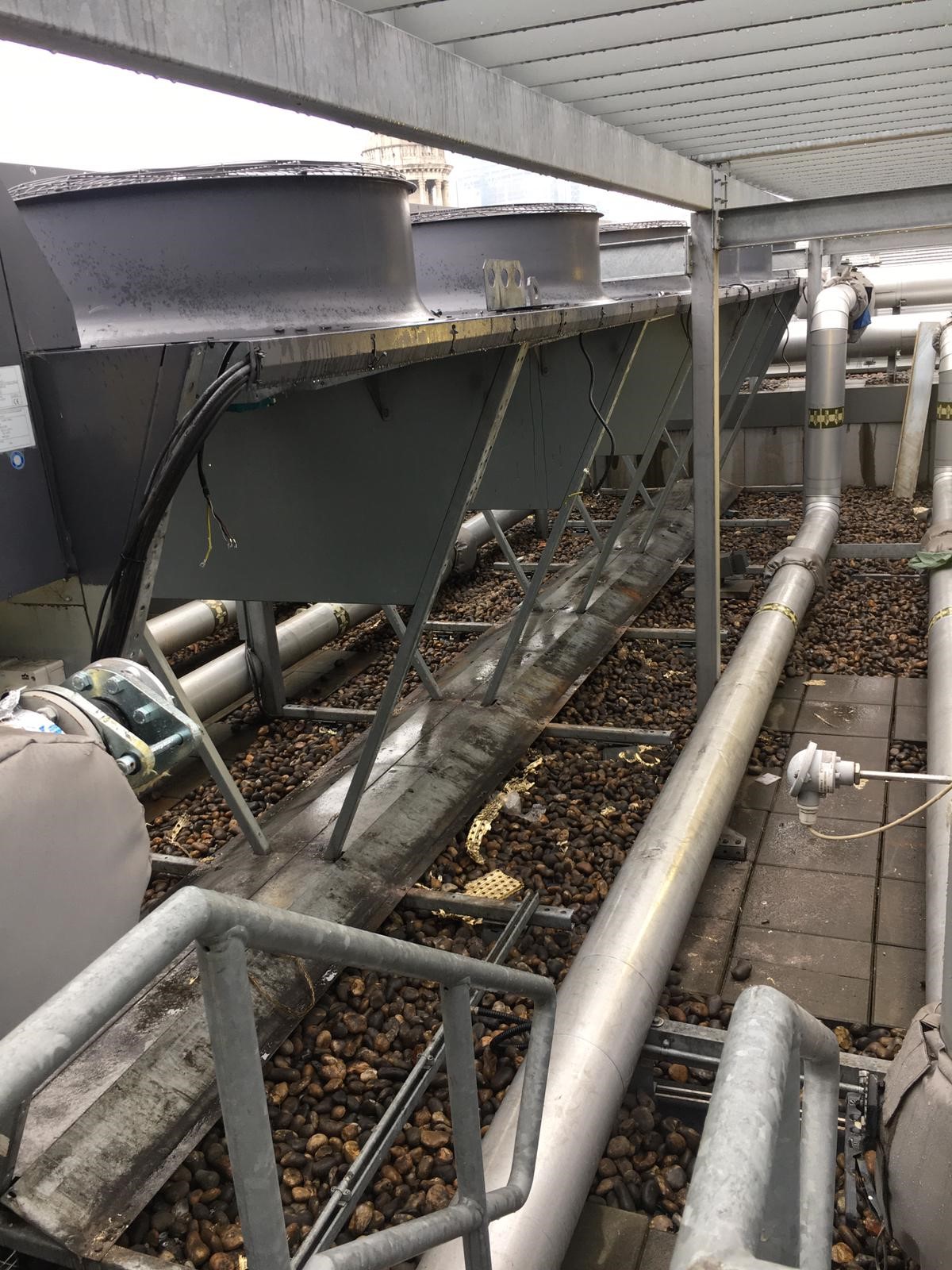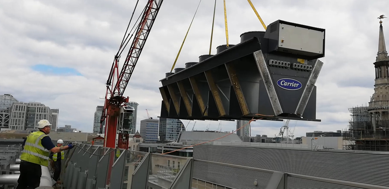 Full plant replacement at One New Change, London — including 8 Carrier dry coolers and a Trane chiller.